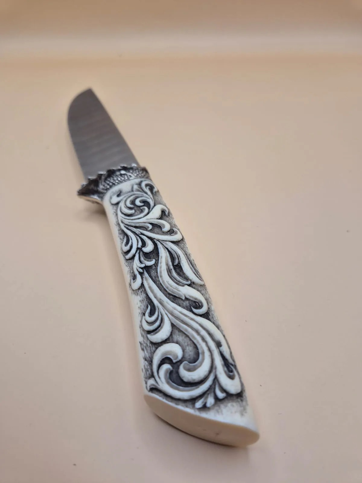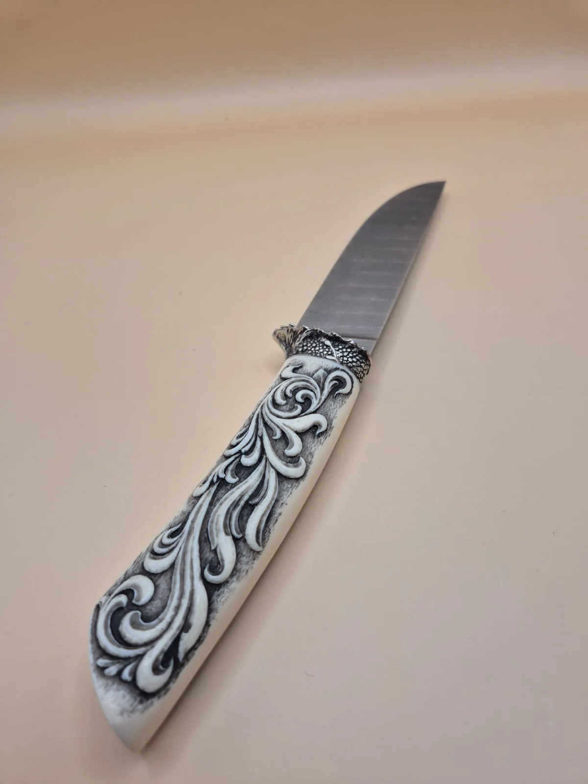 Double dens twist Damasteel · Ivory hand engraved, silver custom made bolster · 120mm